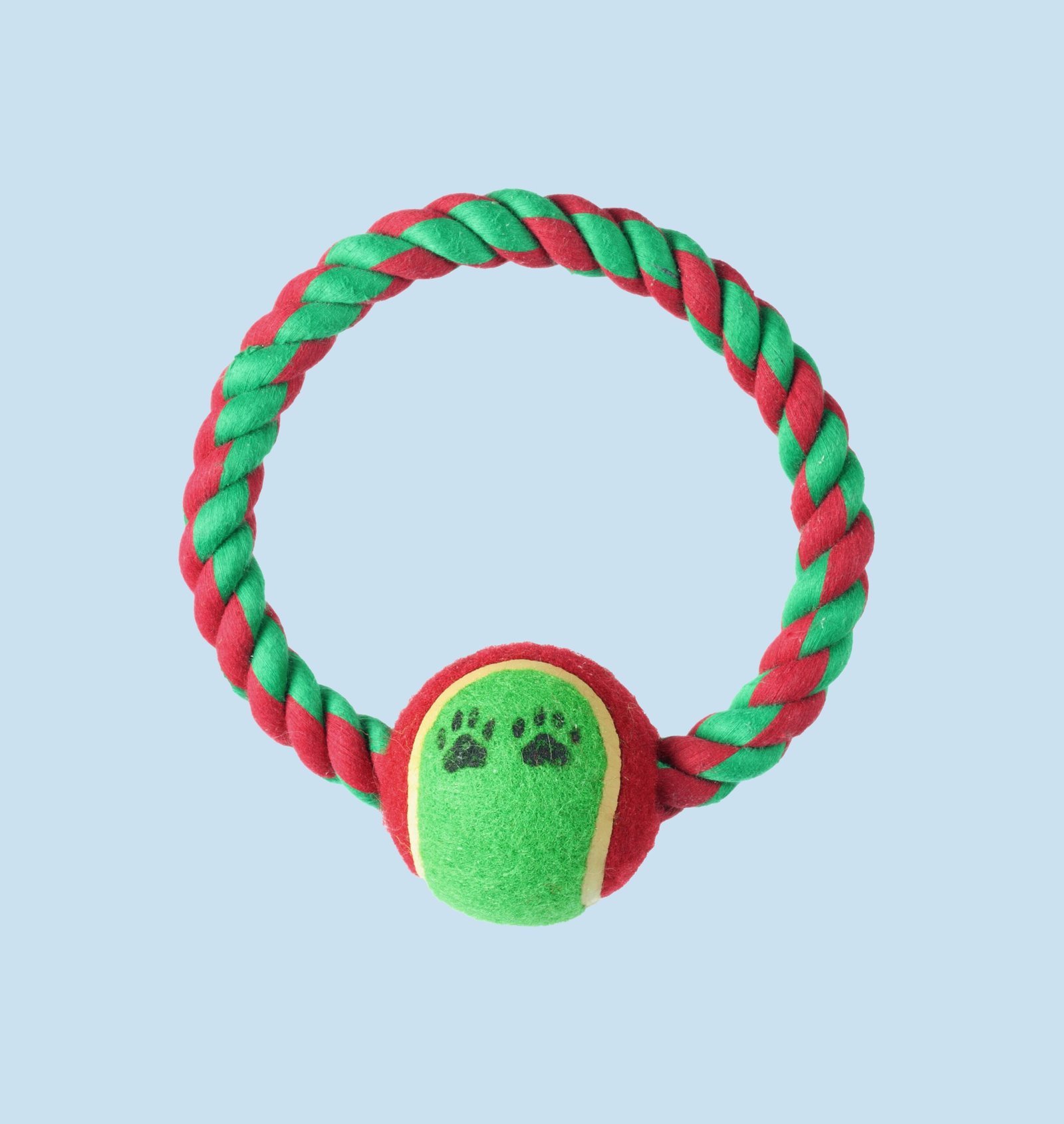 Double the fun with our Tug-N-Toss Rope Ring. This versatile toy combines a durable, tightly woven cotton rope ring with a classic tennis ball, creating the perfect hybrid for interactive play. The sturdy rope is ideal for satisfying tugging instincts and helps clean teeth, while the bouncy ball is great for fetching. Its vibrant red and green colors make it easy to spot. This is the perfect toy to promote healthy exercise and strengthen the bond between you and your dog.
